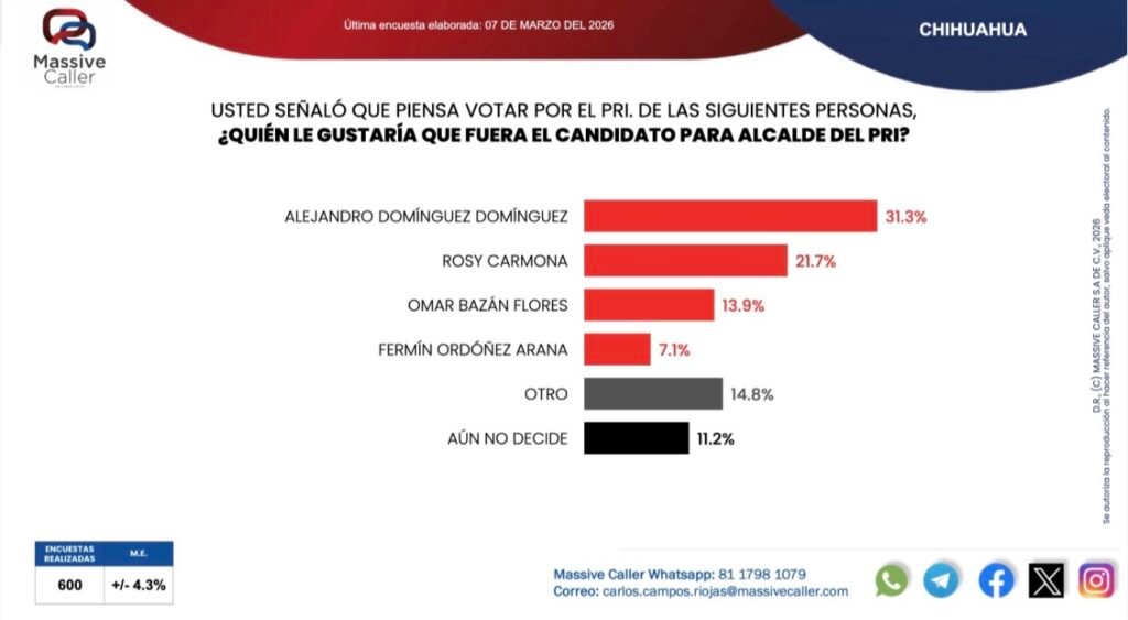 Respecto a las preferencias electorales internas en el PRI, Massive Caller señaló que Alex Domínguez se ubicó en primer lugar con el 31.3 por ciento, seguido por la regidora Rosy Carmona (21.7%), el director del Conalep, Omar Bazán (13.9%) y el líder estatal de Movimiento Territorial, Fermín Ordóñez, con el 7.1 por ciento.