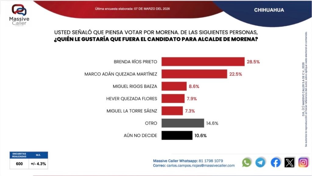 Mientras que por Morena, en primer lugar apareció la diputada local Brenda Ríos, con el 28.5 por ciento, seguida por el expriista y exalcalde Marco Adán Quezada (22.5%), el regidor Miguel Riggs (8.6%); el funcionario federal Hever Quezada (7.9%) y el exdirigente municipal del PAN, Miguel La Torre (7.3%).
