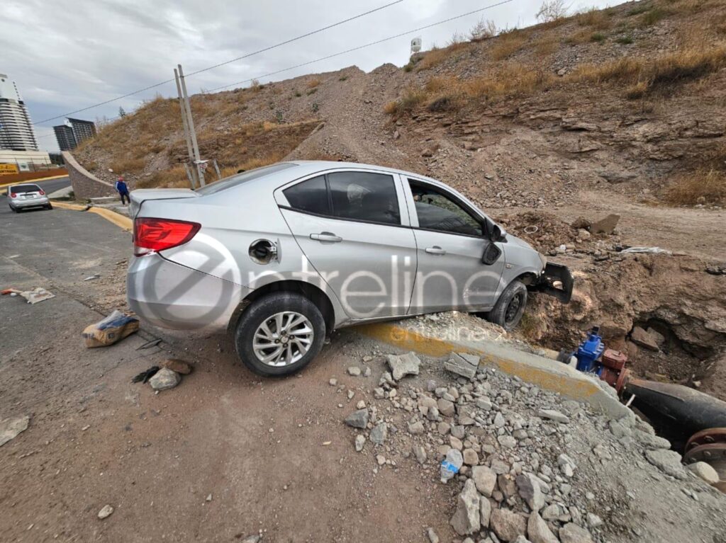 Tras derribar los señalamientos, el automóvil cayó dentro de la excavación, no sin antes arrastrar una carrucha y una revolvedora que permanecían a un lado de la obra. Por fortuna, los trabajadores habían concluido sus labores minutos antes y ya se habían retirado del sitio.