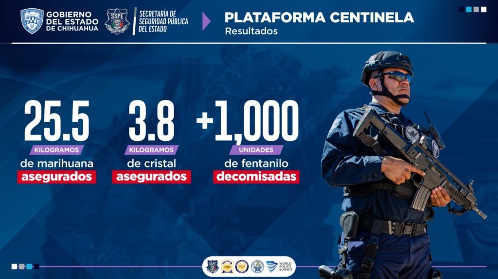 En materia de combate a las drogas, se logró el decomiso de 23 kilogramos de marihuana, 3.8 kilogramos de cristal y más de mil dosis de fentanilo, derivado de labores de análisis, videovigilancia y seguimiento táctico.