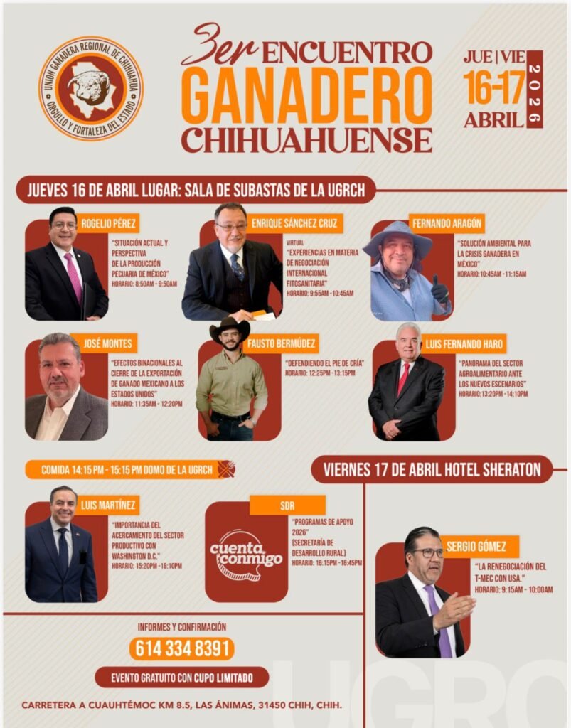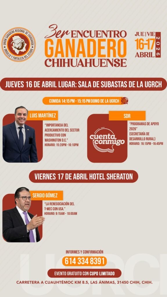 La Unión Ganadera Regional de Chihuahua (UGRCH) realizará la tercera edición del Encuentro Ganadero Chihuahuense, donde se contará nuevamente con investigadores y especialistas de talla nacional e internacional, los días 16 y 17 de abril.