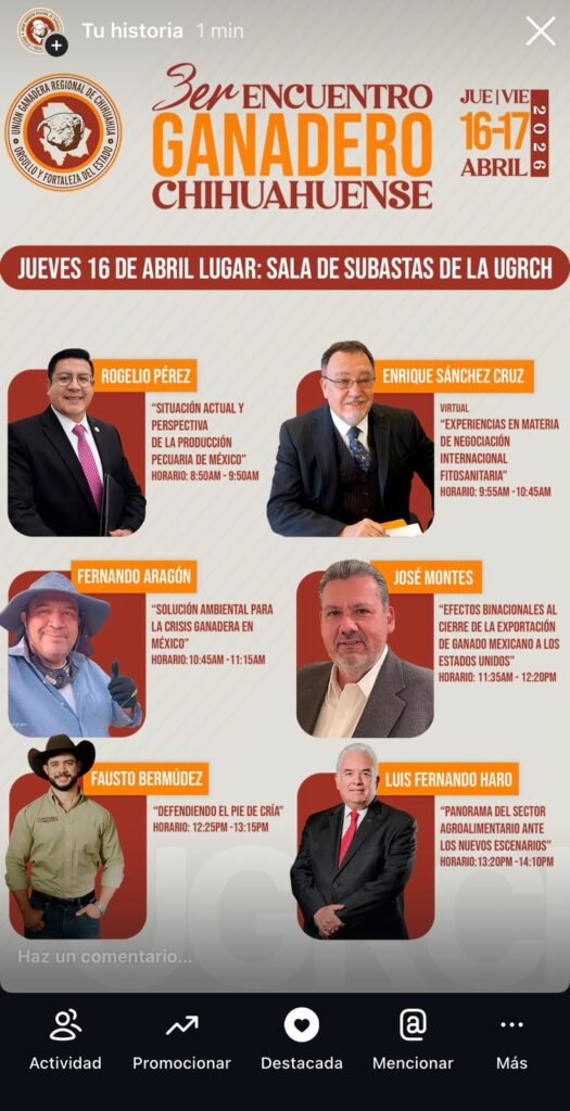 Bustillos Fuentes destacó que el programa contempla u la situación actual y la perspectiva de la ganadería en México tras la situación actual derivada del gusano barrenador, así como los efectos binacionales en la exportación, soluciones ambientales, el panorama del sector agroalimentario y experiencias en materia de negociación dentro del mercado ganadero.