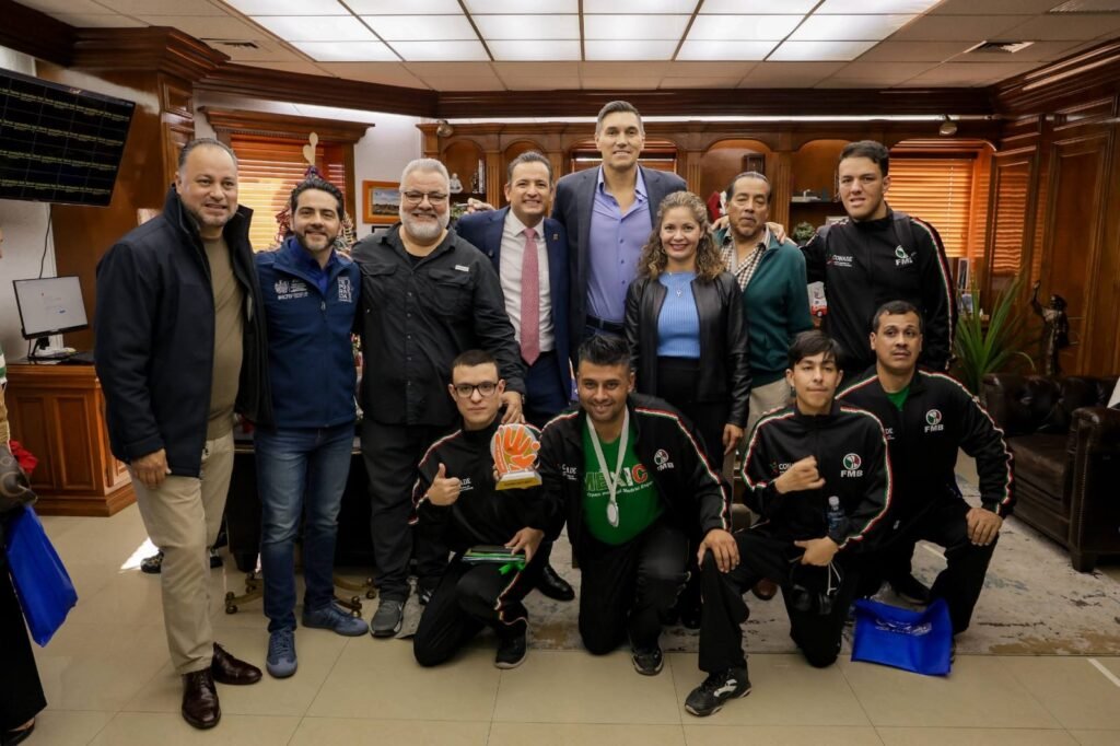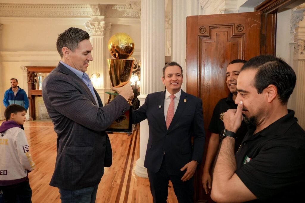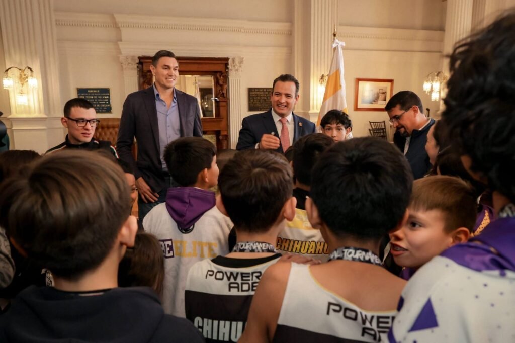H. Ciudad de Chihuahua, Chih., a 10 de diciembre de 2025.- El alcalde Marco Bonilla recibió en la Presidencia Municipal a niños y jóvenes deportistas de diferentes equipos representativos de la ciudad, a quienes se les sorprendió con la visita de Eduardo Nájera, chihuahuense ex jugador profesional en la NBA .
