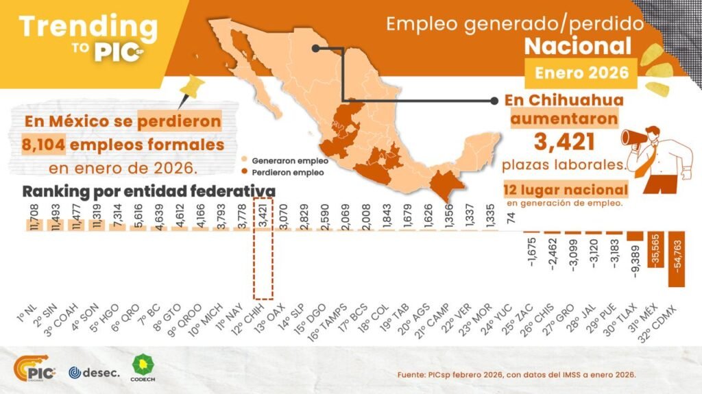 De las 32 entidades del país, 8 presentaron pérdidas de empleo en el mes de enero de 2026, los estados que lideraron las perdidas fueron: 1. Ciudad de México con -54,763, 2. Estado de México con -35,565 y Tlaxcala con -9,389.
