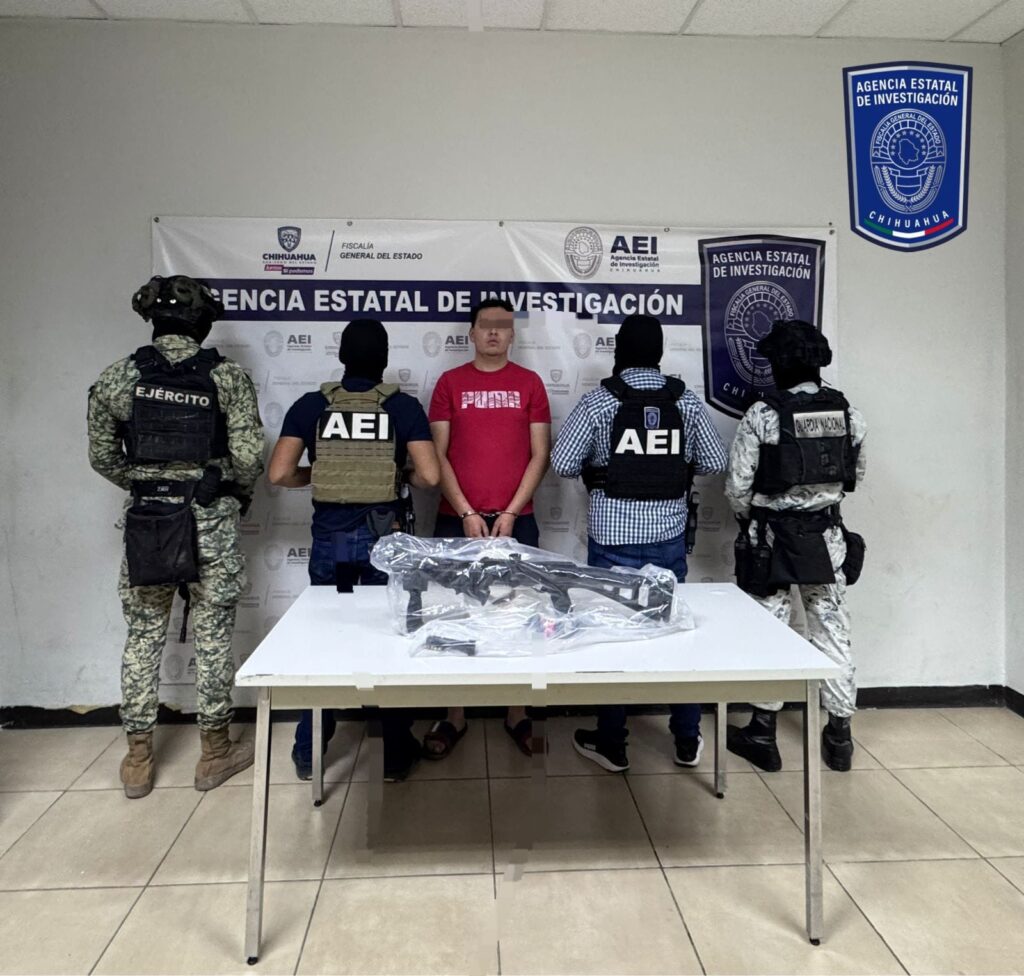Elementos de la Agencia Estatal de Investigación, adscritos a la Fiscalía de Distrito Zona Norte, en colaboración con el Ejército Mexicano y la Guardia Nacional, detuvieron en flagrancia a un masculino que se identificó como Jair Ricardo G. C., por posesión de un arma de fuego,
