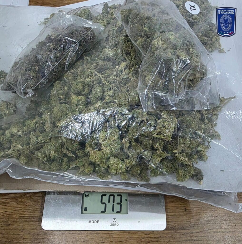 Al proceder a revisar el vehículo, los agentes encontraron dos identificaciones cuyo nombre se pone en reserva para las investigaciones correspondientes, así como 14 bolsas transparentes que contenían una hierba verde con las características de la mariguana con un peso de 573 gramos.