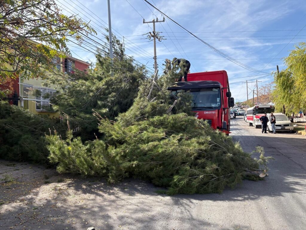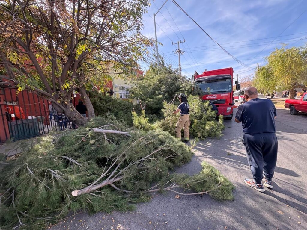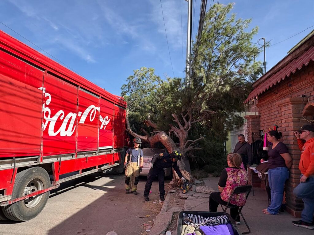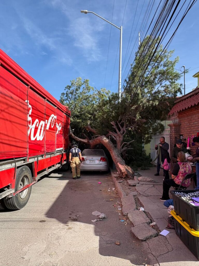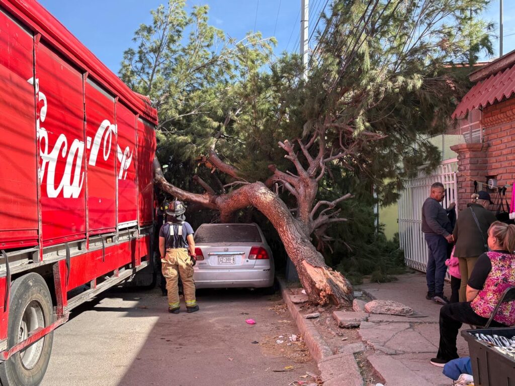 Un camión de la empresa coca-cola con número económico chh-01 161 que circulaba sobre la calle Francisco de Saucedo crucé con Anacleto de Canaval en sentido de oeste a este; el conductor dijo que había vehículos estacionados en el tianguis en doble fila por lo que se hizo a un costado pero no observó la enorme rama de un pino el cual golpea y de arriba haciéndolo caer por completo encima de un vehículo Honda Civic de color gris que estaba estacionado.