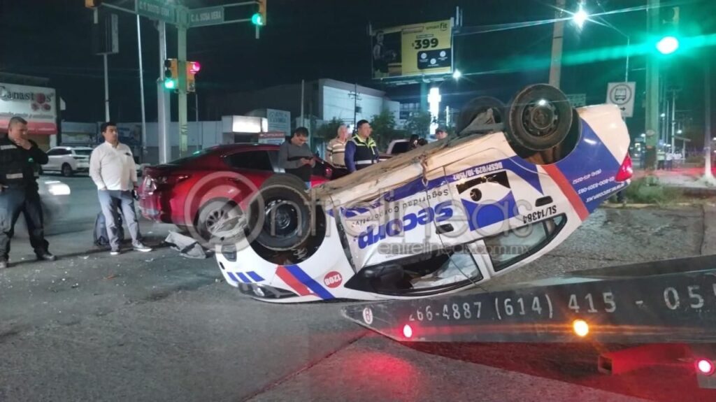 La noche de este martes se registró un aparatoso choque con volcadura en el cruce de la avenida Dostoyevski y Sosa Vera, a la altura de la colonia Chihuahua 2000, que dejó dos personas lesionadas y cuantiosos daños materiales.