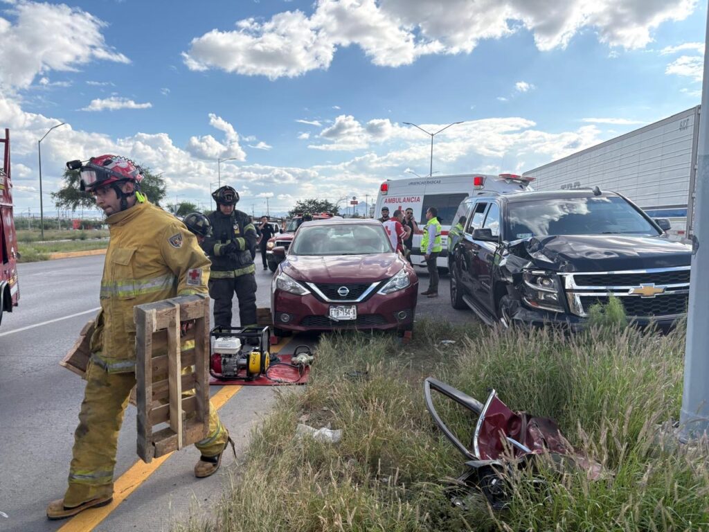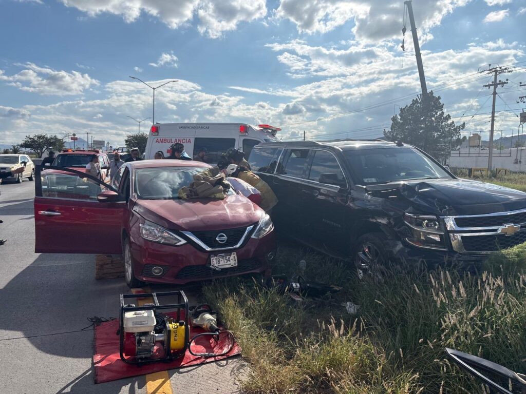 Este jueves se registró un aparatoso choque con atrapados sobre la carretera Aldama y fuerza aérea entre la conductora de Nissan Sentra guinda y conductor de Chevrolet Suburban negra.