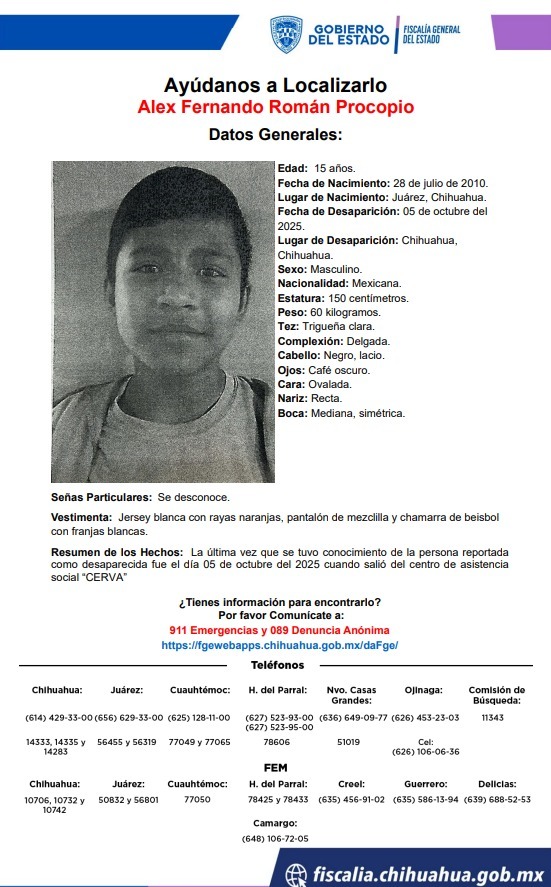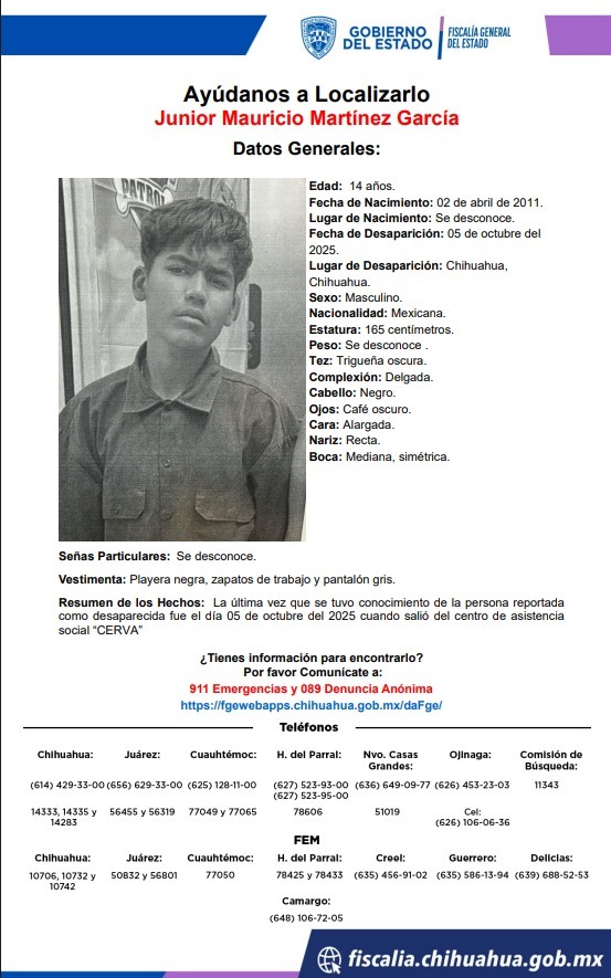 La Fiscalía General del Estado (FGE) publicó los reportes de ausencia de 3 adolescentes que salieron el pasado 05 de octubre del Centro de Asistencia Social “CERVA”, en la colonia Vida Digna de la ciudad de Chihuahua.