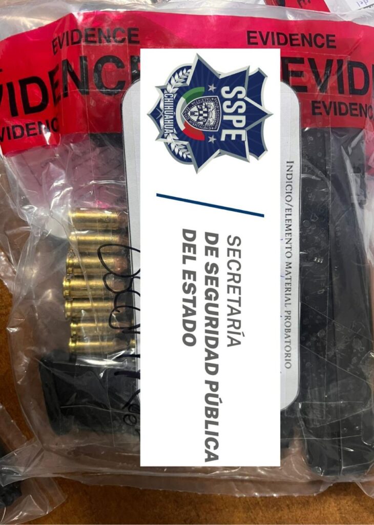 Además, se aseguraron tres cargadores adicionales, uno calibre .40 con 16 cartuchos, uno calibre 9 mm con 10 cartuchos, y otro calibre 9 mm con 7 cartuchos; un cargador desabastecido, y 57 cartuchos útiles calibre 7.62×39 mm.