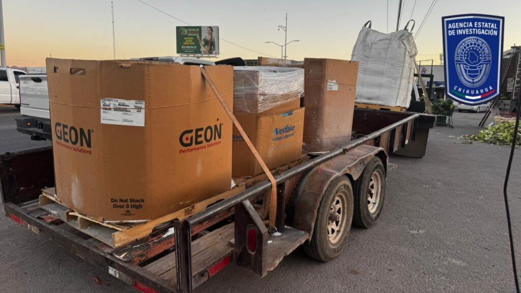 También, decomisaron una traila de la marca Grupo Rem del Norte, modelo 2008, con matrícula de circulación del estado de Chihuahua, sin reporte de robo, que transportaba tres cajas de cartón grandes, las cuales contenían material granulado con las características del material de PVC, con un peso aproximado de tres toneladas.