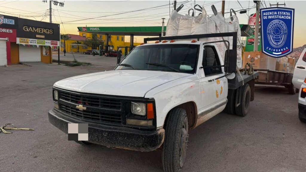 En el operativo, los agentes ministeriales aseguraron, un camión de la marca General Motors, modelo 1994, color blanco y matrícula de circulación del estado de Chihuahua, que cargaba dos costales de lona, los cuales contienen un polvo blanco con las características de resina en polvo, con un peso aproximado de dos toneladas.