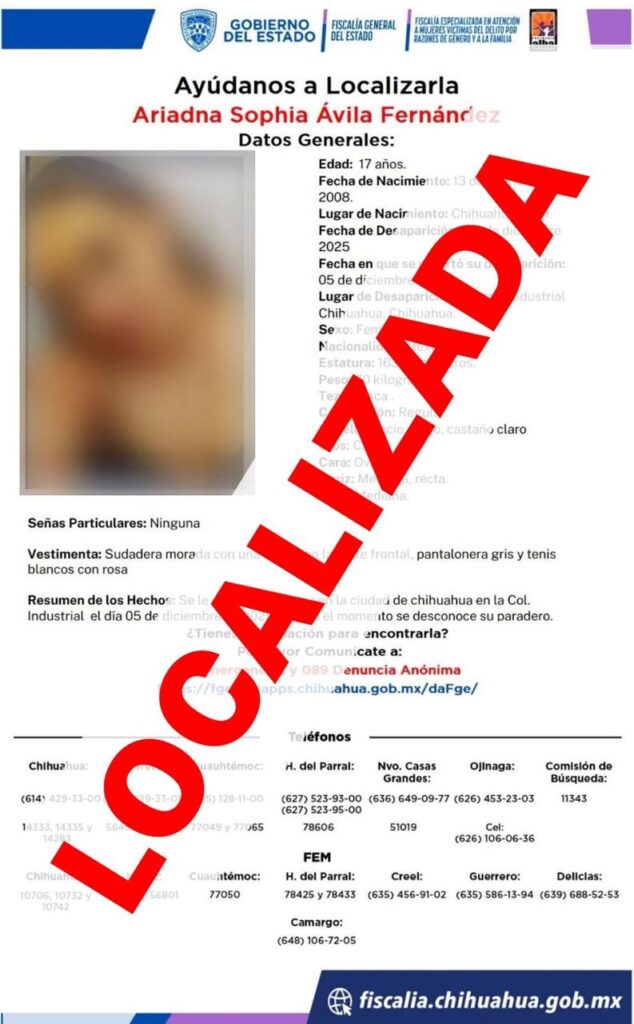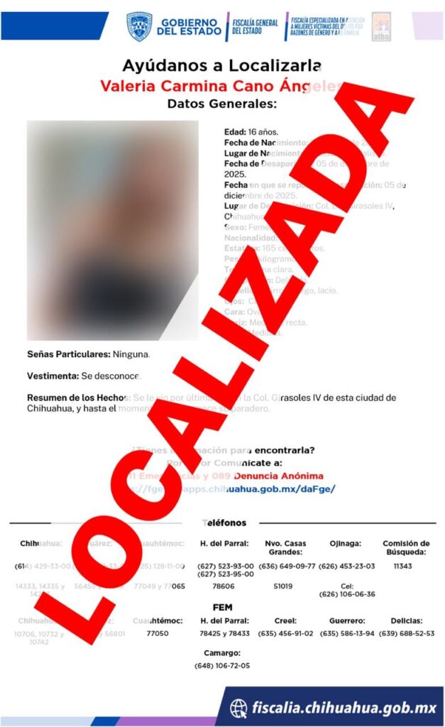 Finalmente, se localizó a la adolescente de iniciales B.P.R.N. de 15 años de edad, quien fue reportada el pasado miércoles día 03 de diciembre por sus familiares tras ausentarse en la colonia Laderas de San Guillermo II.