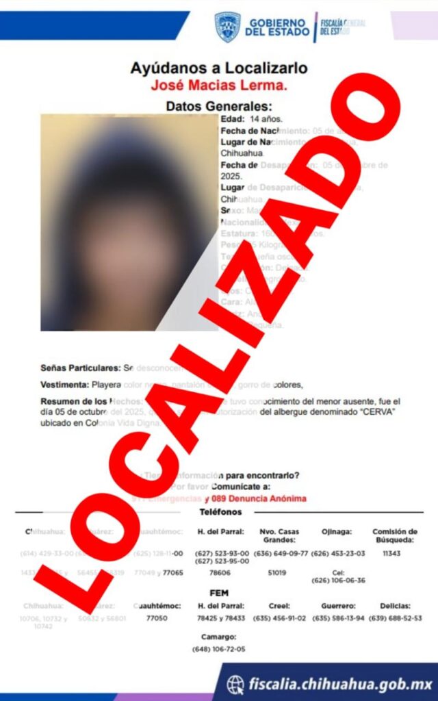 La Unidad Especializada en Personas Ausentes y/o Extraviadas de la Fiscalía de Distrito Zona Centro, localizó sanos y salvos a dos adolescentes que tenían reportes de ausencia en la ciudad de Chihuahua.