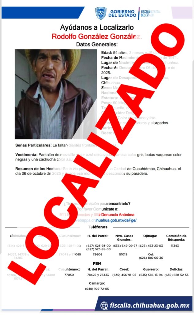 Mientras que, Rodolfo G. G., de 54 años de edad, el pasado lunes 06 de octubre, se salió de su domicilio ubicado en San Juanito, municipio de Bocoyna para ir al municipio de Cuauhtémoc, en donde estuvo con un familiar y posteriormente regresó.
