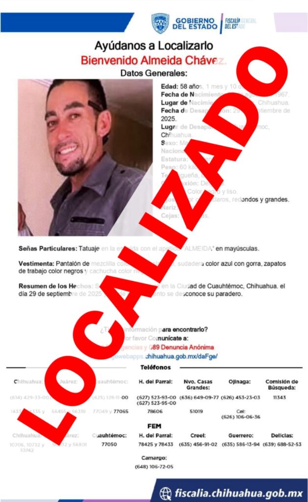 A través de las investigaciones ministeriales se pudo establecer que Bienvenido A. C., de 58 años de edad, quien fue reportado desde el 29 de septiembre del 2025, se encuentra en buen estado de salud, trabajando en la construcción en el estado de Sonora