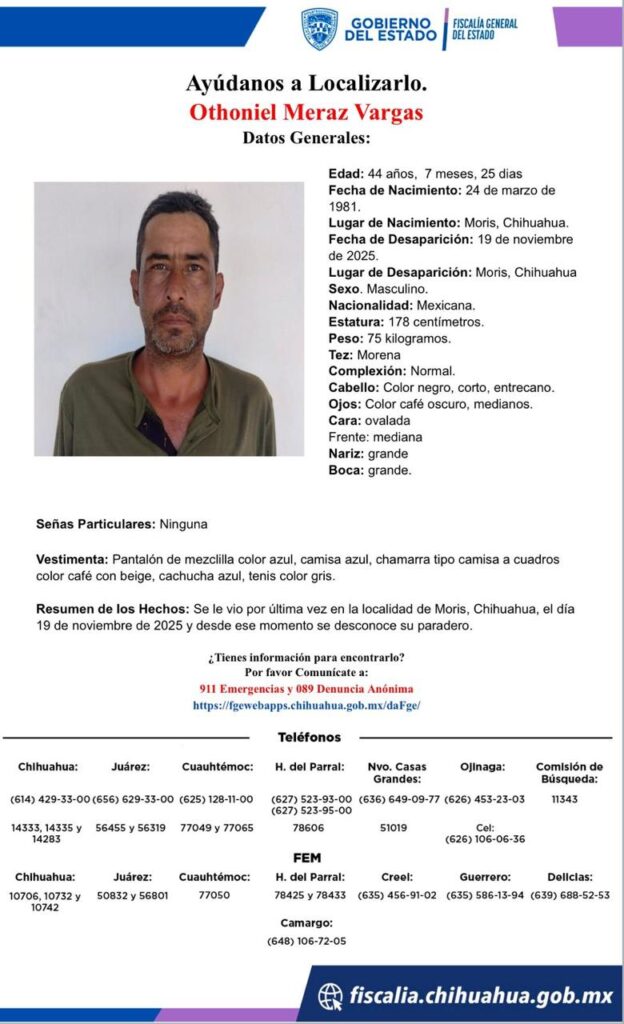 La Fiscalía de Distrito Zona Occidente, a través la Agencia Estatal de Investigación (AEI), realiza diversas acciones para la búsqueda y localización de tres masculinos con reporte de desaparición y/o ausencia, interpuesto el 19 de noviembre de 2025, en el municipio de Moris.