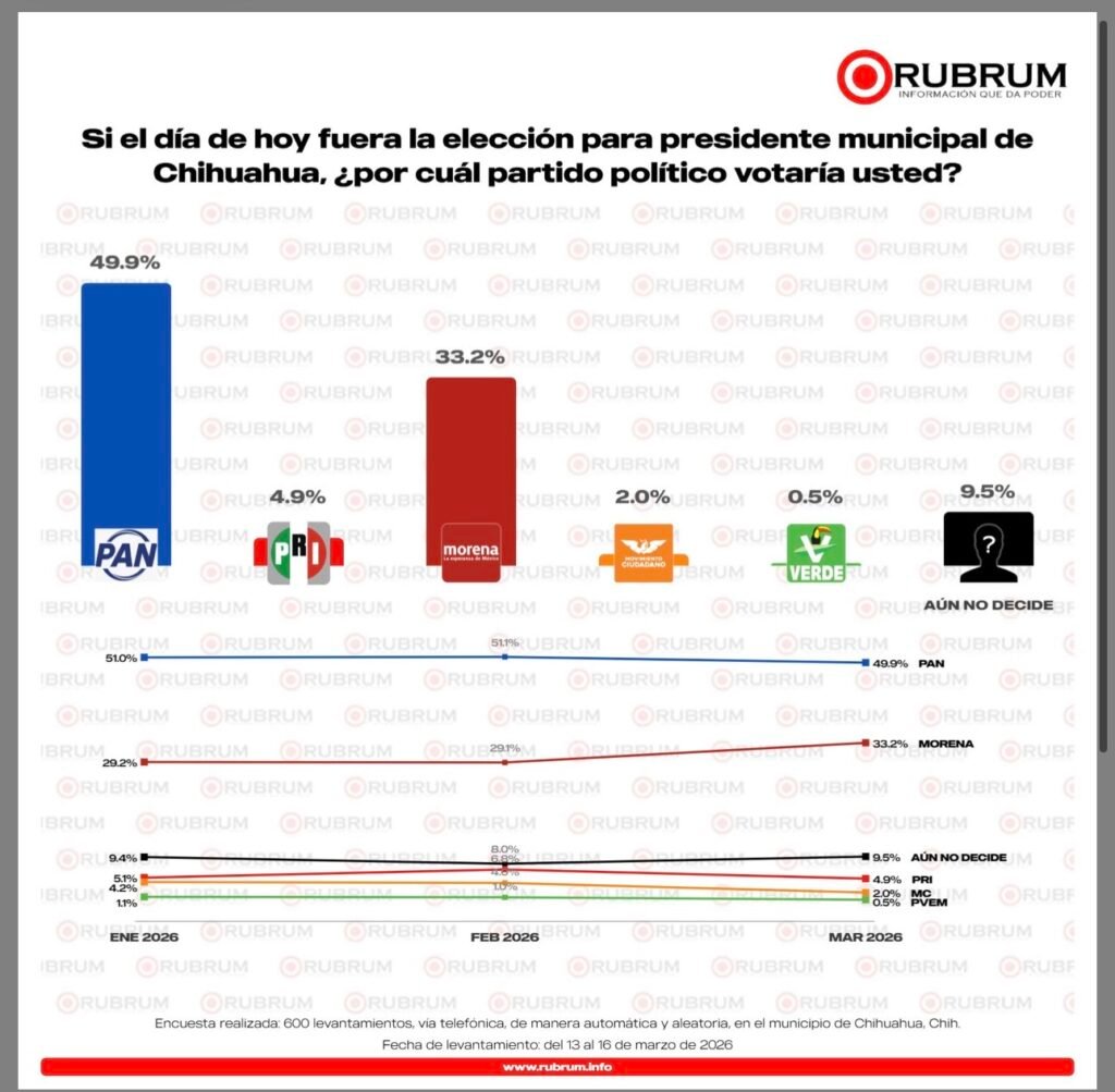 La más reciente encuesta de RUBRUM reveló que el PAN continúa en primer lugar de las preferencias electorales en lo que respecta a la alcaldía de Chihuahua capital, mientras que Morena sigue en segundo y el PRI en tercero, seguidos por Movimiento Ciudadano y el Verde.