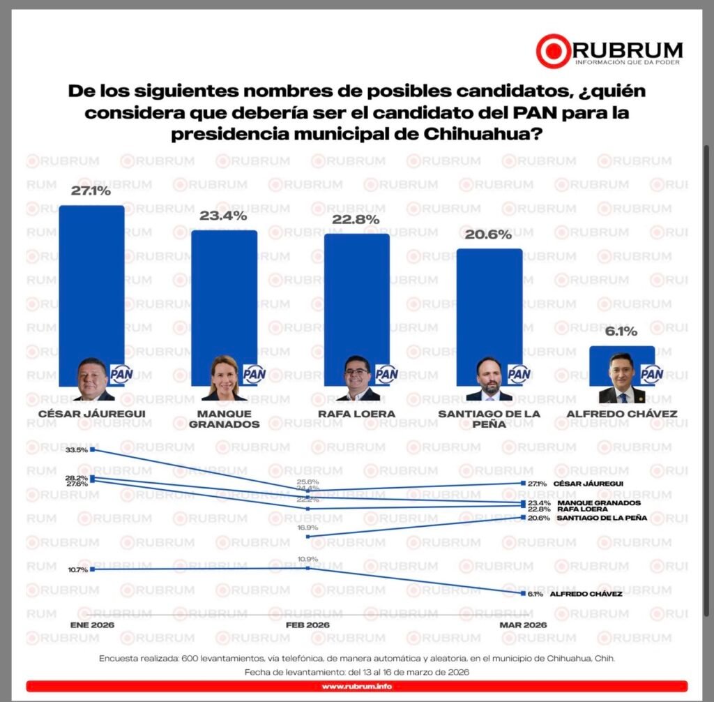 En el caso de Acción Nacional, prácticamente existe un empate técnico entre los punteros, los cuales son el fiscal César Jáuregui (27.1%); la diputada federal Manque Granados (23.4%); el secretario de Desarrollo Humano, Rafael Loera (22.8%); el secretario General de Gobierno, Santiago de la Peña (20.6%) y el coordinador de los diputados locales, Alfredo Chávez (6.1%).