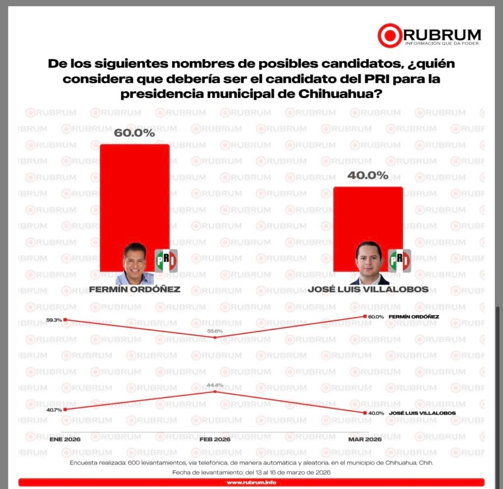 En lo que respecta al PRI, en primer lugar se mantiene el dirigente estatal de Movimiento Territorial, Fermín Ordóñez, con el 60 por ciento de las preferencias, mientras que en segundo lugar se ubicó el diputado local José Luis Villalobos, con el 40 por ciento.