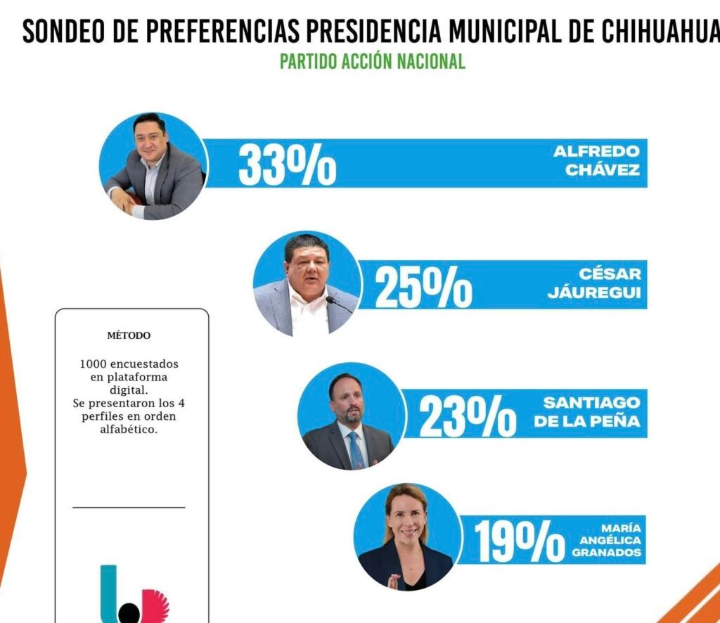 Según un sondeo realizado por el Instituto Tecnológico de Contabilidad, Mercadotecnia y Administración (ITCMA) respecto a las preferencias electorales para la candidatura del PAN a la alcaldía de Chihuahua capital, el coordinador del Grupo Parlamentario de Acción Nacional en el Congreso del Estado, Alfredo Chávez, se ubicó en el primer lugar con el 33 por ciento de las preferencias.