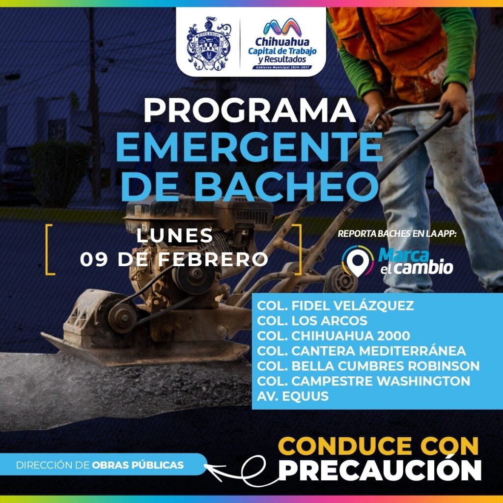 El Gobierno Municipal, a través de la Dirección de Obras Públicas, realizará trabajos de bacheo este lunes 9 de febrero mediante el programa emergente en calles de las colonias: Fidel Velázquez, Los Arcos, Chihuahua 2000, Cantera Mediterránea, Bella Cumbres Robinson y Campestre Washington, así como en la avenida Equus. Para seguridad de conductores, se exhorta […]