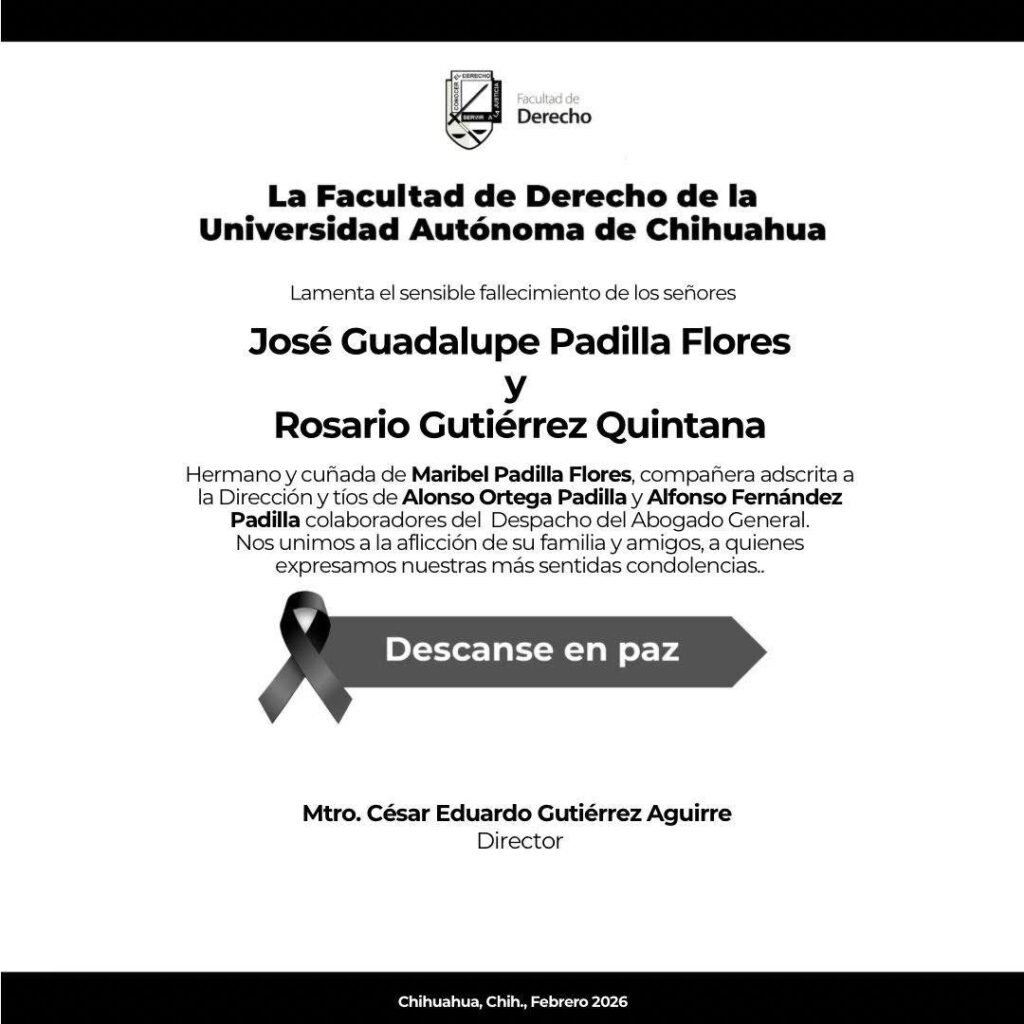 El director de la Facultad de Derecho de la Universidad Autónoma de Chihuahua (UACH), César Gutiérrez, lamentó el fallecimiento de la pareja de adultos mayores que perdieron la vida tras un choque durante la madrugada de este domingo. Se trata de quienes en vida respondían a los nombres de José Guadalupe Padilla Flores y Rosario […]