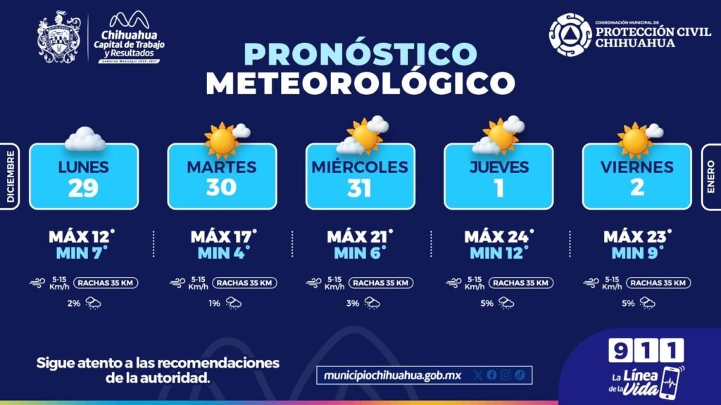 La Coordinación Municipal de Protección Civil informa que, durante la semana del lunes 29 de diciembre al viernes 2 de enero, se presentará un inicio con temperaturas frías, principalmente por las mañanas, con una tendencia gradual al aumento de las máximas conforme avance la semana. Para el lunes 29, se prevé una temperatura máxima de […]