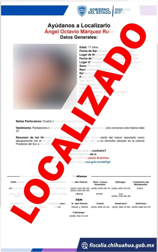 Como resultado de una efectiva implementación de los protocolos de búsqueda coordinados por la Fiscalía de Distrito Zona Sur, este viernes se localizó sano y salvo a José Enrique O.V., de 29 años de edad, quien fue reportado como desaparecido el 18 de marzo del presente año, en el municipio de Cuauhtémoc. La última ocasión […]