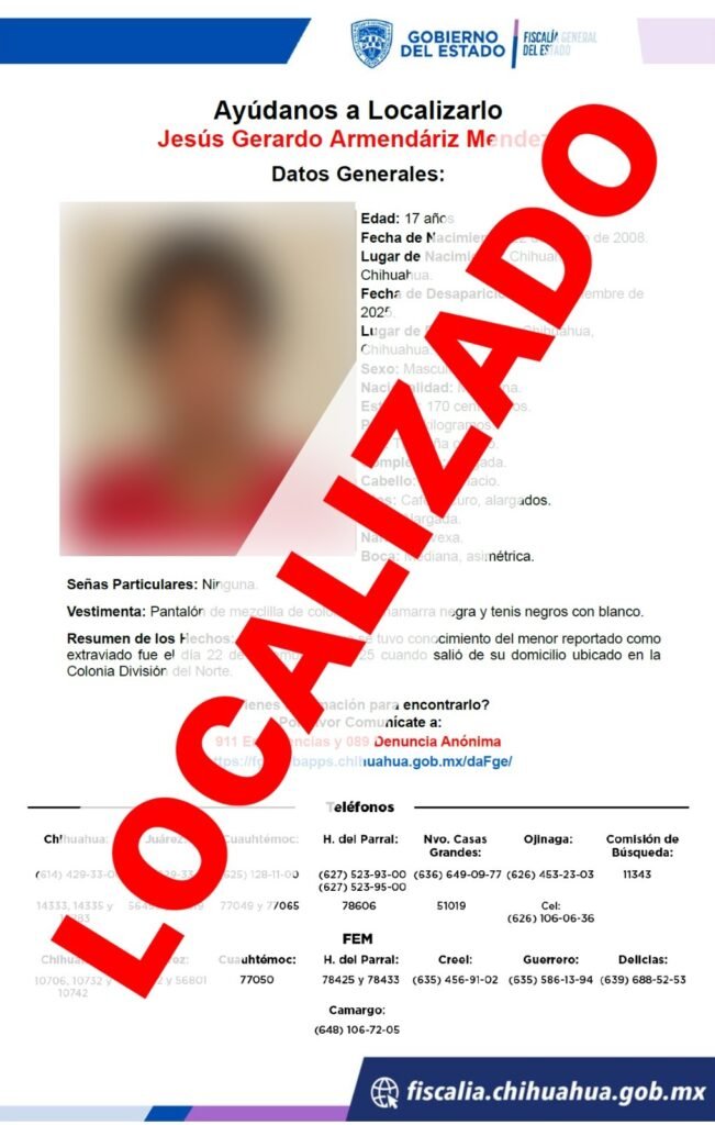 La Unidad Especializada en Investigación de Personas Ausentes y/o Extraviadas de la Fiscalía de Distrito Zona Centro, localizó sanos y salvos a dos adultos y a dos adolescentes que contaban con reporte de ausencia y/o extravío, en diferentes hechos y fechas, en la ciudad de Chihuahua. Como resultado de los protocolos de búsqueda se localizó […]