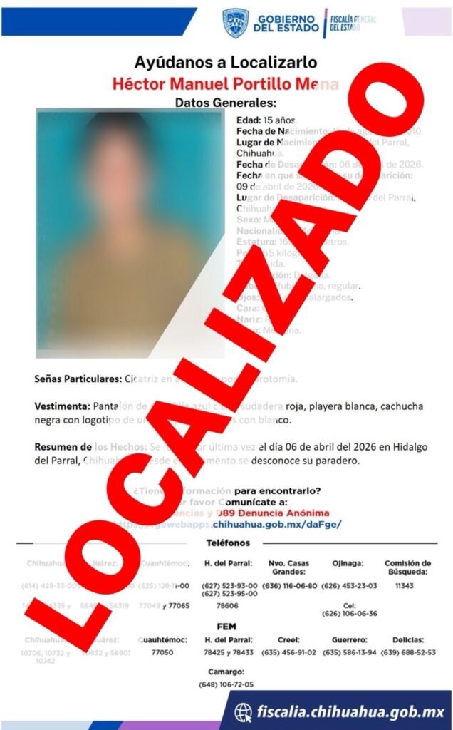 La Fiscalía de Distrito Zona Sur localizó sano y salvo a un adolescente de iniciales H.M.P.M., que contaba con reporte de ausencia interpuesto el 09 de abril del presente año en la ciudad de Parral. Derivado de las indagatorias coordinadas por la Unidad Especializada en Investigación de Personas No Localizadas y Desaparecidas, el menor de […]