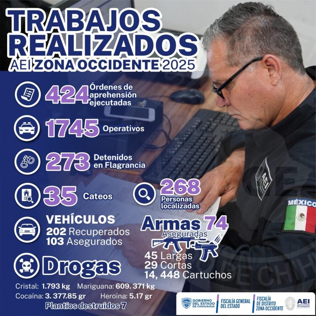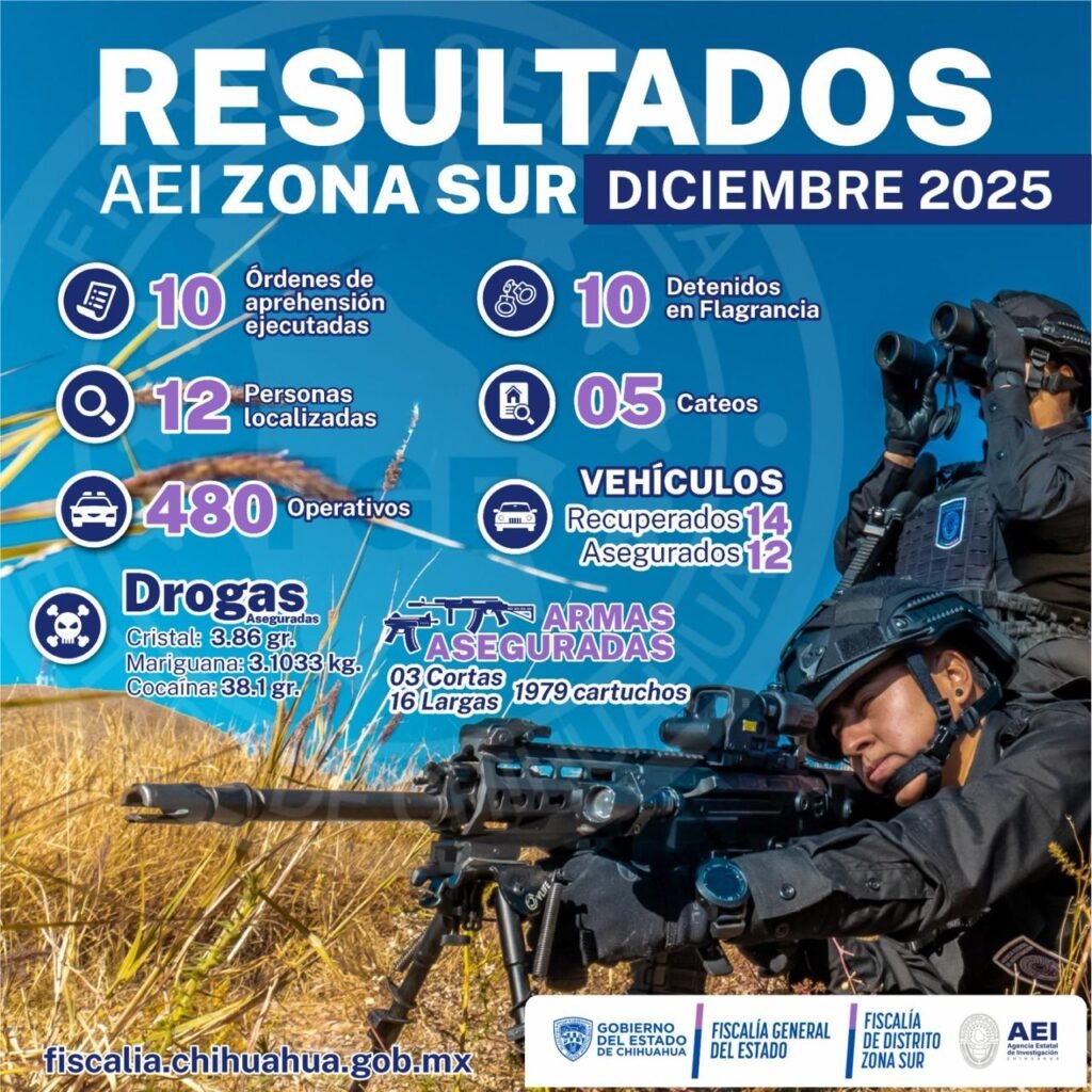 La Fiscalía de Distrito Zona Sur, a través de la Agencia Estatal de Investigación (AEI), informa los resultados obtenidos durante el mes de diciembre de 2025, derivados de las labores de investigación, prevención y reacción implementadas en la región. Durante este periodo, el personal investigador recuperó 14 vehículos con reporte de robo y aseguró 12 […]