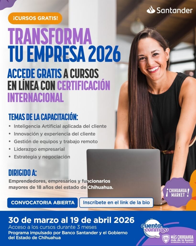 El Gobierno del Estado de Chihuahua, a través de la Secretaría de Innovación y Desarrollo Económico (SIDE), en coordinación con Banco Santander, invita a participar en el programa “Transforma tu Empresa Chihuahua 2026”, una iniciativa orientada a fortalecer a las micro, pequeñas y medianas empresas mediante capacitación en línea de nivel internacional. La estrategia busca […]