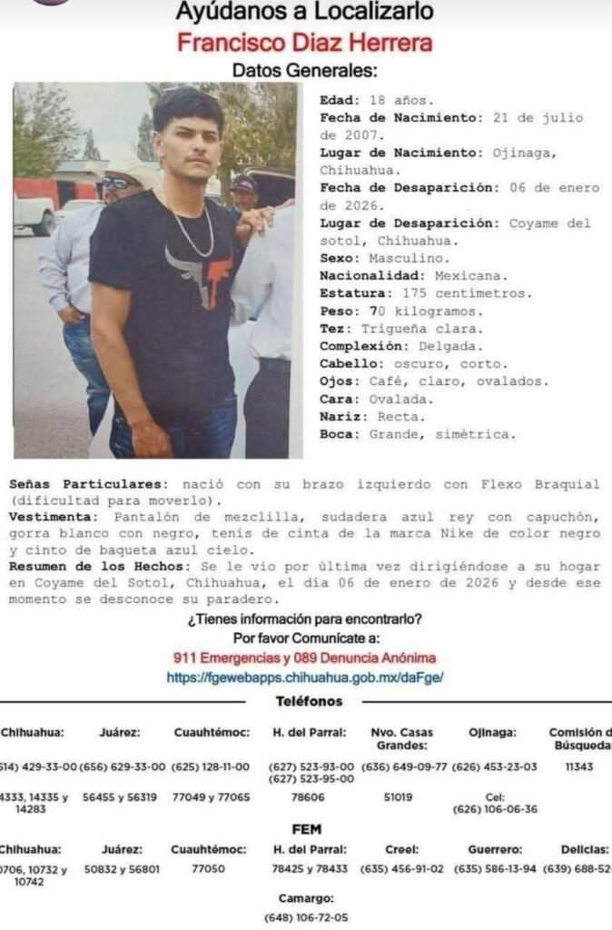 A tráves de redes sociales se dio a conocer que el joven Francisco Díaz Herrera, de 18 años de edad y con reporte de desaparición desde el 06 de enero en Coyame del Sotol, fue encontrado sin vida. El padre del joven, Francisco Díaz expresó en sus redes sociales que ya localizó a su hijo, […]