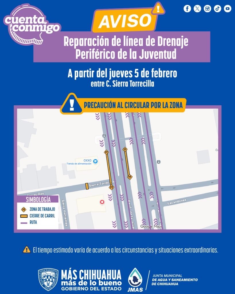 La Junta Municipal de Agua y Saneamiento de Chihuahua comenzará el jueves 5 de febrero, los trabajos de reparación de un tramo de línea de drenaje en el periférico De la Juventud y Sierra Torrecillas, afectado por excavaciones a cargo de un contratista de la Comisión Federal de Electricidad (CFE). Las labores iniciarán a las […]