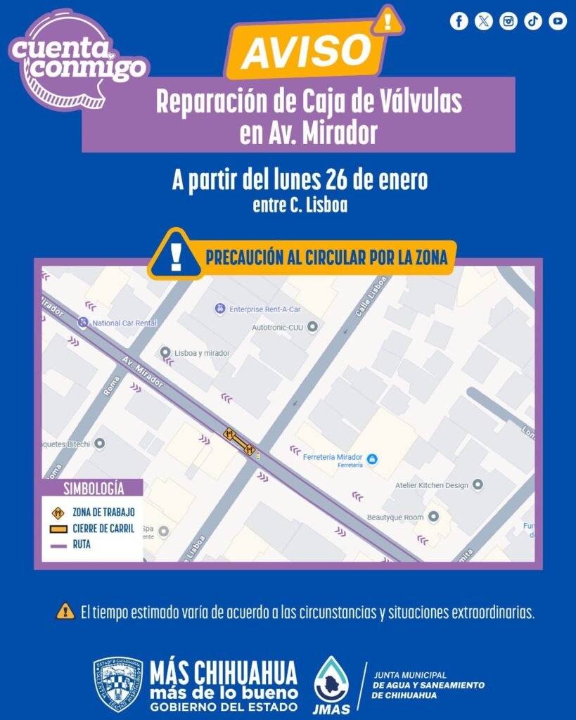 Reparará JMAS Chihuahua caja de válvulas en la avenida Mirador este próximo lunes
