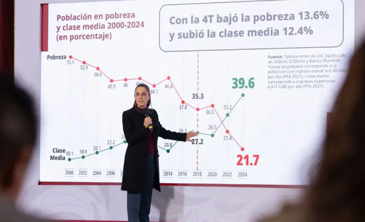 Ciudad de México. Con la política de bienestar y los aumentos salariales, en siete años de gobierno de la cuarta transformación disminuyó 13.6 por ciento la población en situación de pobreza y aumentó 12.4 por ciento la clase media, informó la presidenta Claudia Sheinbaum, con base en datos del Banco Mundial. “Se llama cuarta transformación, gobierno […]