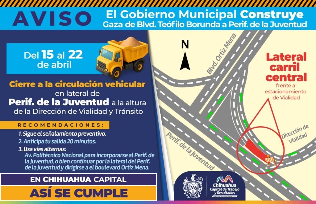 – Las labores comenzarán este miércoles 7 de enero Con motivo del inicio de los trabajos de construcción de la gaza de incorporación que conectará la avenida Teófilo Borunda con el Periférico de la Juventud, el Gobierno Municipal, a través de la Dirección de Obras Públicas, informa a la ciudadanía las rutas alternas que estarán […]