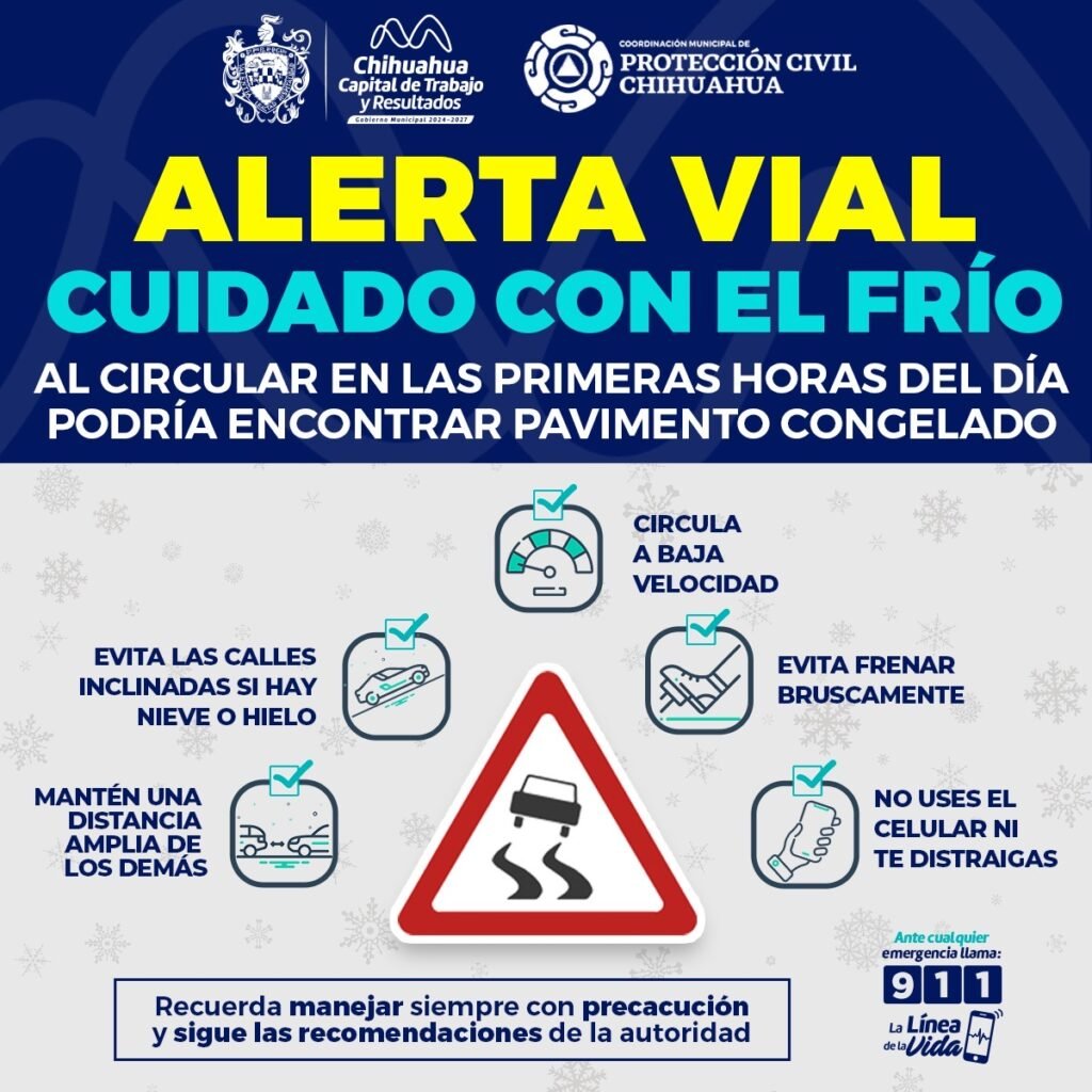 *_H. Ciudad de Chihuahua, Chih., a 11 de enero de 2026_*.- El Gobierno Municipal de Chihuahua a través de la Coordinación Municipal de Protección Civil, informa que para el día lunes por la mañana existe la probabilidad de precipitaciones de nieve o aguanieve, por lo que exhorta a la ciudadanía a conducir con precaución ante […]