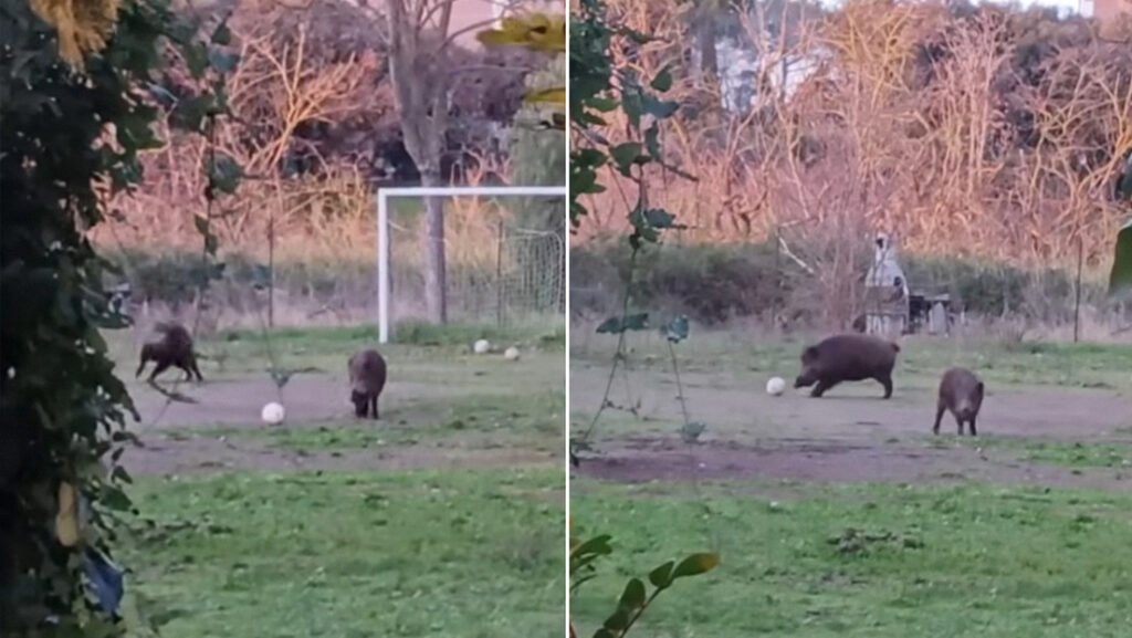 Captan a jabalíes “jugando” futbol en Italia