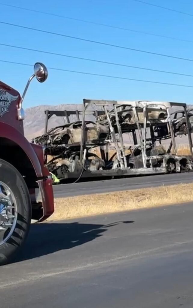 Un tráiler que transportaba nuez sufrió daños en su caja al intentar desviar el vehículo hacia el camellón central de pasto. El incidente ocurrió debido a que la carretera estaba obstruida por una madrina que transportaba vehículos nuevos de agencia y que se incendió en el lugar desde la noche de viernes.
