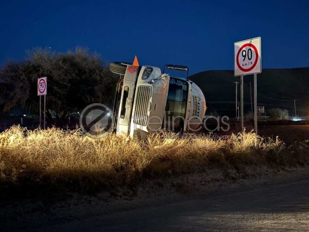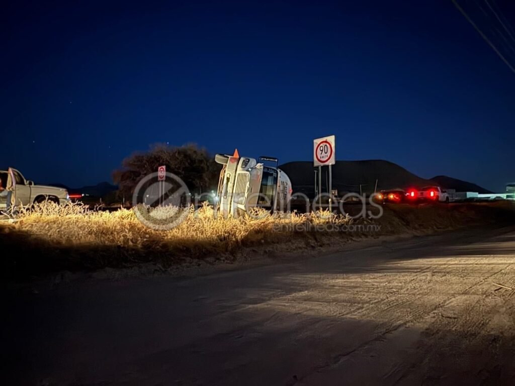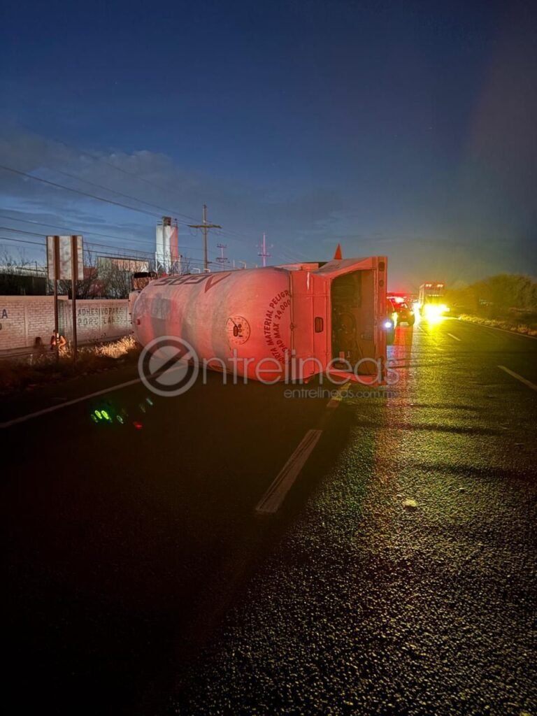 La noche de este viernes se registró la volcadura de una pipa de gas perteneciente a la empresa Gas Económico a la altura del kilómetro 208 de la carretera Delicias–Chihuahua, en el sentido de circulación de Chihuahua hacia Delicias, a unos metros del entronque con el Libramiento Oriente.