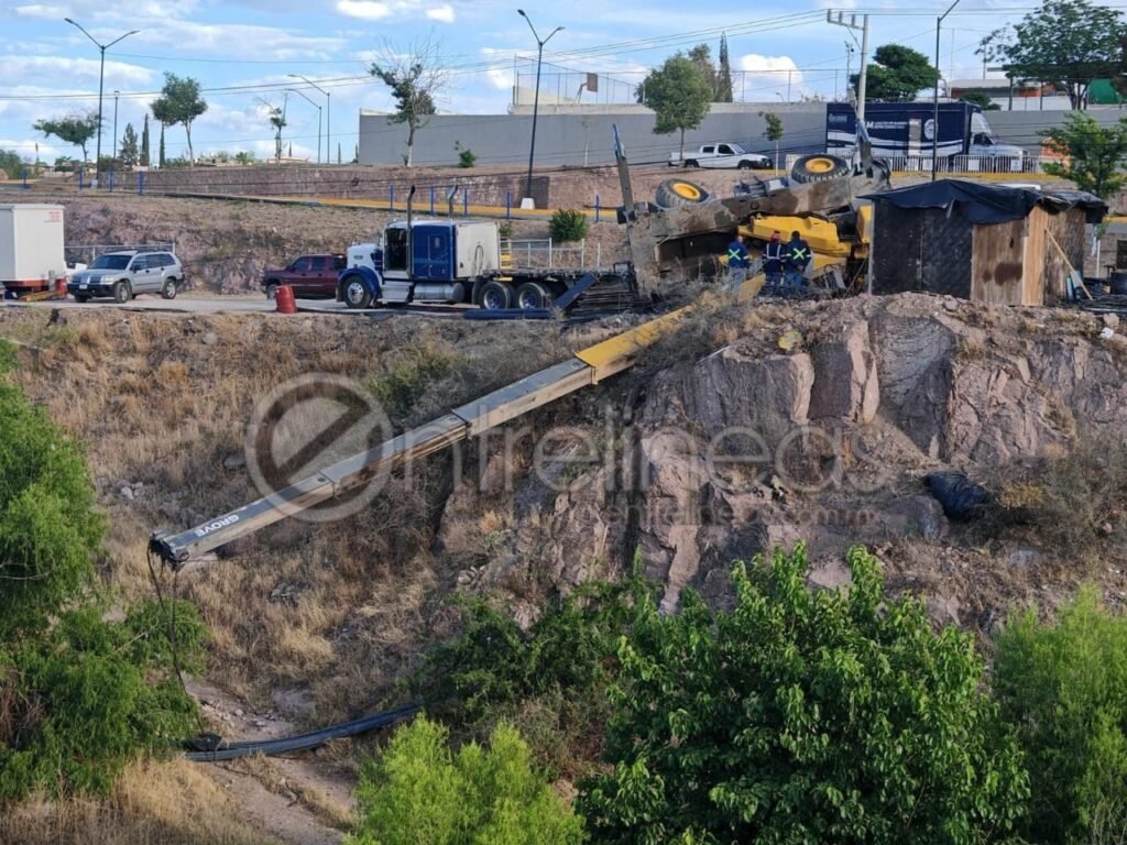 De acuerdo con los primeros reportes, la unidad se encontraba descargando material para la construcción de un puente o gaza de incorporación hacia el Periférico de la Juventud, cuando al efectuar maniobras se ladeó y terminó volcada sobre su costado izquierdo. La pesada maquinaria quedó en una posición de riesgo, a punto de caer al interior del río Chuviscar, con una altura aproximada de 30 metros.